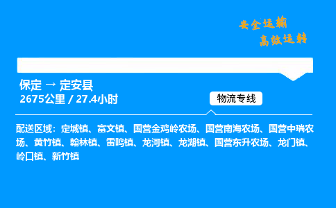 保定到定安县物流公司全程约2675公里公里,专线运输用时大约27.4小时小时,可运输直达定城镇、富文镇、国营金鸡岭农场、国营南海农场、国营中瑞农场、黄竹镇、翰林镇、雷鸣镇、龙河镇、龙湖镇、国营东升农场、龙门镇、岭口镇、新竹镇,凯冉物流可承接:整车运输、零担运输、大件运输、轿车托运、危险品运输、机械设备运输、汽车配件运输、食品饮料运输、办公家具运输、电子电器运输、行李搬家物流运输、电动车摩托车托运等货物的物流业务; 13303201605 点击拨打电话