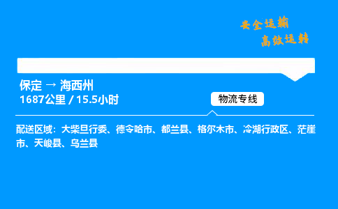 保定到海西州物流公司全程约1687公里公里,专线运输用时大约15.5小时小时,可运输直达大柴旦行委、德令哈市、都兰县、格尔木市、冷湖行政区、茫崖市、天峻县、乌兰县,凯冉物流可承接:整车运输、零担运输、大件运输、轿车托运、危险品运输、机械设备运输、汽车配件运输、食品饮料运输、办公家具运输、电子电器运输、行李搬家物流运输、电动车摩托车托运等货物的物流业务;全程直达,无需中转,保定到海西州的专线能实现每天发车,可上门提货,送货到点,为工厂、贸易商、批发商、电商以及个人等货主提供货物安全有保障的运输服务,那保定到海西州这条快运专线运费怎么算,下面我们来详细介绍下。
