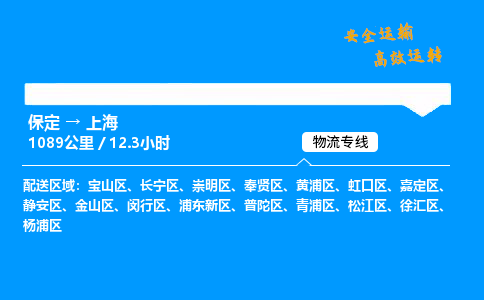 保定到上海物流公司全程约1089公里公里,专线运输用时大约12.3小时小时,可运输直达宝山区、长宁区、崇明区、奉贤区、黄浦区、虹口区、嘉定区、静安区、金山区、闵行区、浦东新区、普陀区、青浦区、松江区、徐汇区、杨浦区,凯冉物流可承接:整车运输、零担运输、大件运输、轿车托运、危险品运输、机械设备运输、汽车配件运输、食品饮料运输、办公家具运输、电子电器运输、行李搬家物流运输、电动车摩托车托运等货物的物流业务;全程直达,无需中转,保定到上海的专线能实现每天发车,可上门提货,送货到点,为工厂、贸易商、批发商、电商以及个人等货主提供货物安全有保障的运输服务,那保定到上海这条快运专线运费怎么算,下面我们来详细介绍下。