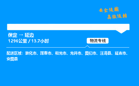 保定到延边物流公司全程约1296公里公里,专线运输用时大约13.7小时小时,可运输直达敦化市、珲春市、和龙市、龙井市、图们市、汪清县、延吉市、安图县,凯冉物流可承接:整车运输、零担运输、大件运输、轿车托运、危险品运输、机械设备运输、汽车配件运输、食品饮料运输、办公家具运输、电子电器运输、行李搬家物流运输、电动车摩托车托运等货物的物流业务;全程直达,无需中转,保定到延边的专线能实现每天发车,可上门提货,送货到点,为工厂、贸易商、批发商、电商以及个人等货主提供货物安全有保障的运输服务,那保定到延边这条快运专线运费怎么算,下面我们来详细介绍下。